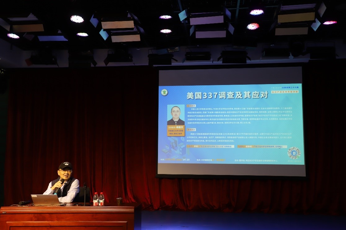 10月24日,“大家谈”第二十六期在图书馆大学城校区负一楼演播厅举办,由图书馆与湾区知识产权实施和法律保障研究中心联合主办。本次讲座特邀政协第十三届广东省委员会委员、中国知识产权法学研究会副秘书长、教育部人文社会科学专家、华南理工大学法学院杨雄文教授以《美国337调查及其应对》为题主讲,我校法学院罗莉教授主持,翟鹏威老师与谈。图书馆馆长房亚明及师生共计200余人参加。