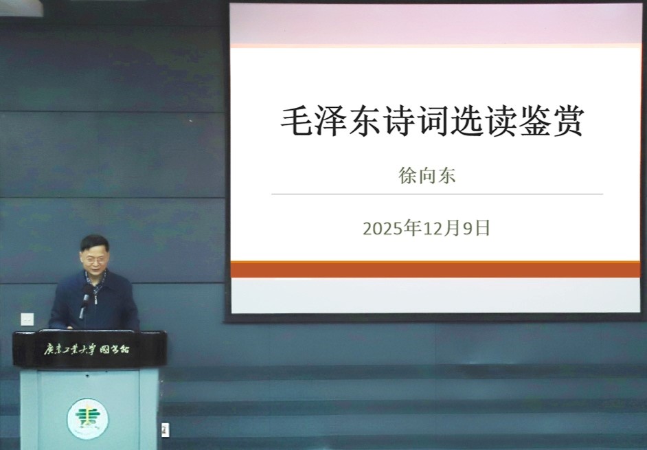 12月9日下午,“红图薪火”第一期“毛泽东诗词选读鉴赏”在图书馆大学城校区馆负一楼报告厅成功举办。本次讲座特邀我校生物医药学院党委书记徐向东主讲,图书馆党总支书记赵振辉主持,大学城校区馆党员及学生150多人参加。