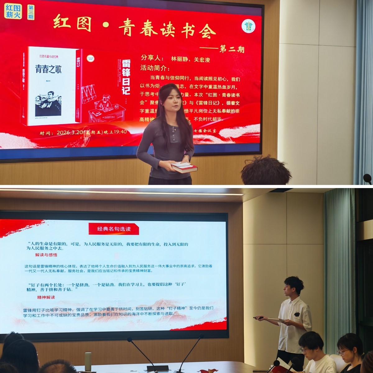 自由分享环节,现场师生踊跃交流感悟,结合两部红色经典,畅谈新时代如何将雷锋的奉献精神、革命青年的理想信念融入专业学习与日常实践,在观点碰撞中深化了对红色精神传承的理解。