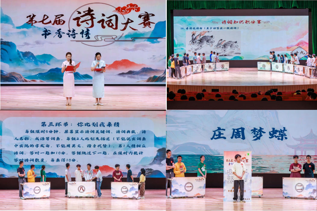 为加强优秀传统文化传承,展现中华文化的独特魅力,图书馆已连续七届成功举办校园文化优秀成果品牌活动—— “诗词大赛”,现场气氛紧张热烈、扣人心弦。30位才华横溢的选手以诗会友,展开了一场诗意盎然的才情较量。经过“诗词知识积分赛”、“抢答淘汰赛”、“你比划我来猜”和“飞花令冠亚军争霸赛”四个环节激烈角逐,“深藏Blue队”的吕浩、钟明宸、毛大为三位选手力压群雄,摘得本次大赛桂冠。比赛间隙,精彩纷呈的文艺表演轮番登场,双狮献瑞灵动昂扬、古典舞蹈曼妙雅致、古筝演奏婉转悠扬,将现场气氛推向一个又一个高潮,为师生呈现一场融诗词雅韵、舞蹈雅乐、传统技艺于一体的国风文化盛宴,是学校以文化人、以美育人的生动实践与成果体现。