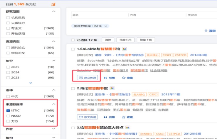 通过统一检索筛选出原文传递的文献:用户检索后,可从左侧聚类筛选中选择筛选来源数据库,其中NSTL与ISTIC为期刊增强版范畴。